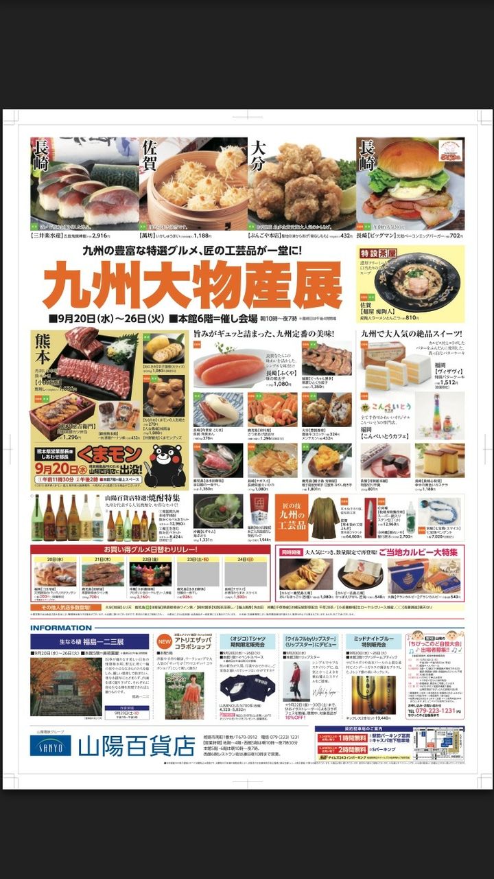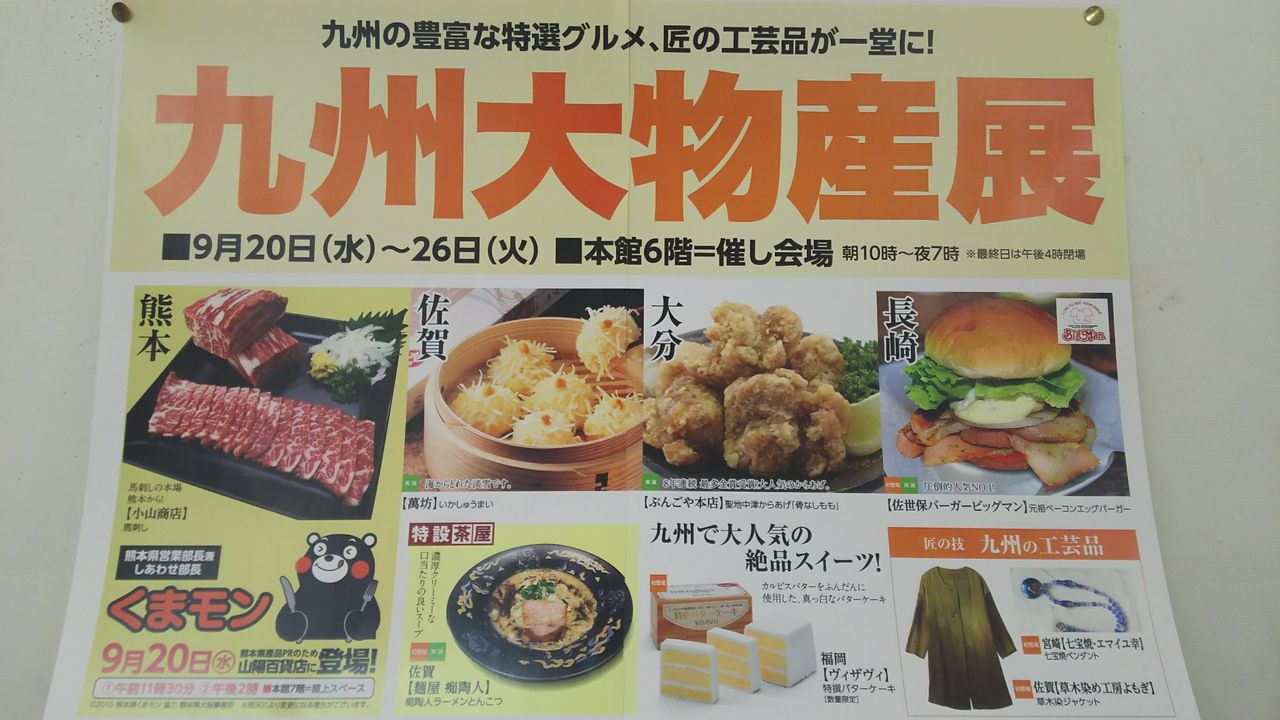 山陽百貨店『大九州物産展』 2017年09月20日 本日9月20日から山陽百貨店にて行われる『大九州物産展』に当店も参加出店しております熊本から新鮮な馬刺をはじめ馬油製品も多数取り揃えて皆様のお越しをお待ちしておりますm(__)m初日には『くまモン』も来店します🎵最終日の26日は16時の閉場となります営業部 坂本憲昭 カテゴリなしの他の記事 < 前の記事次の記事 >
